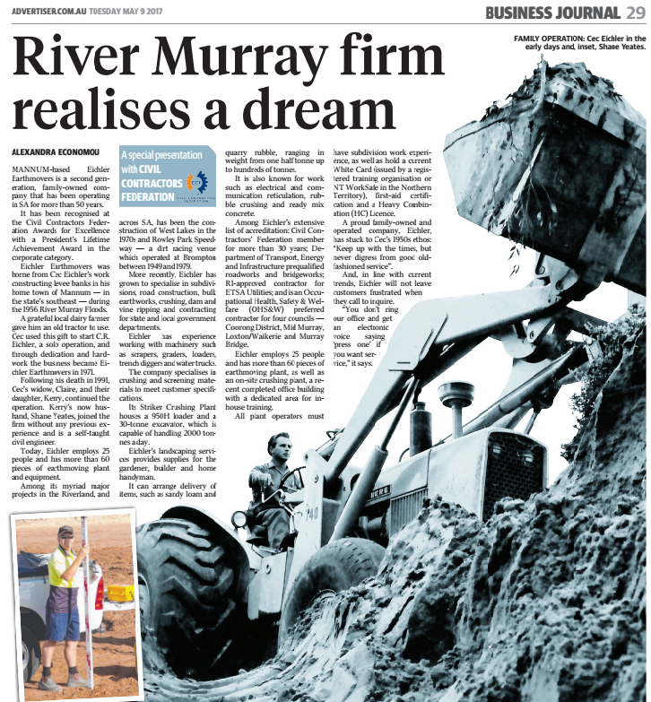 Eichler proudly celebrates its 50th year in business. Incorporated since 1970, its inception was in the fifties, where the founder Cec Eichler realised an opportunity for Earthmoving after the famous 1956 flood. The flood presented a need for rebuilding the destroyed levy banks, and the rest is “history”. 50 years on, Eichler is stronger than ever, our client book is growing by the day, and we continue to be just as passionate about supporting local as we are supporting South Australia and beyond.
